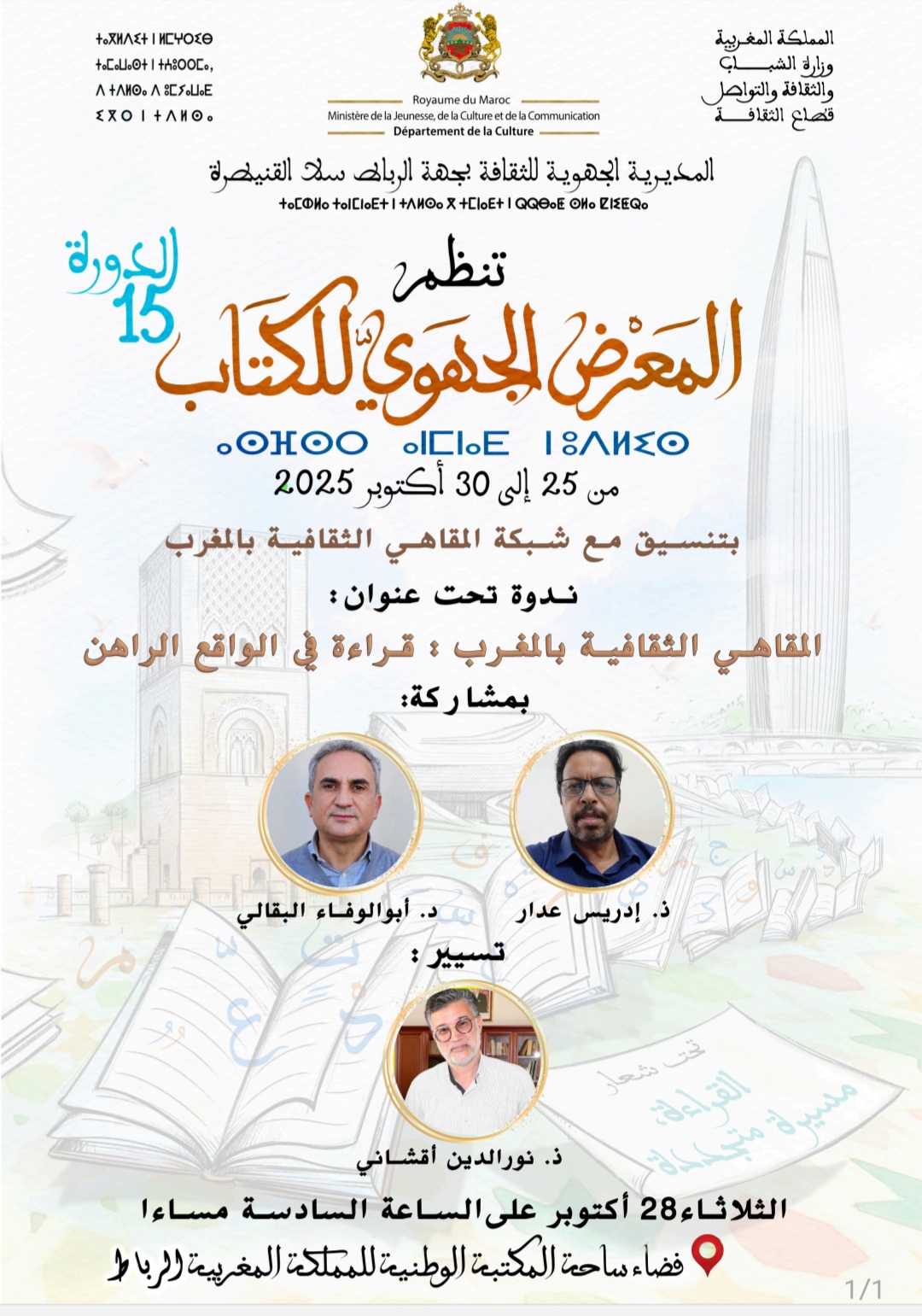 بعد نسخة مدينة تمارة للسنة الماضية، برمجت شبكة المقاهي الثقافية بالمغرب بتنسيق مع المديرية الجهوية للثقافة بجهة الرباط سلا القنيطرة ثلاث لقاءات بالمعرض الجهوي للكتاب في نسخته ال15 المنظم تحت شعار “القراءة مسيرة متجددة ” وذلك بساحة المكتبة الوطنية للمملكة المغربية بالرباط حسب البرنامج التالي :