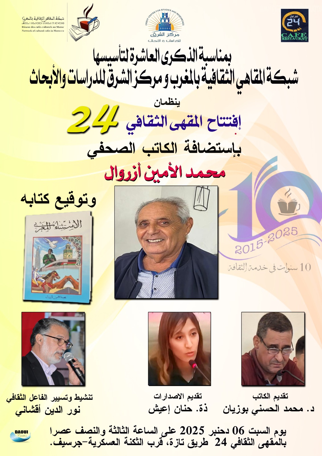 وبتنسيق مع مركز الشرق للدراسات والأبحاث ، تنظم الشبكة ، المقهى الثقافي الأول بإستضافة الكاتب الصحفي محمد الأمين أزروال في حفل توقيع كتابه ” الإستثناء المغربي ” بمقهى 24 ،طريق تازة قرب الثكنة العسكرية بجرسيف على الساعة الثالثة والنصف عصرا .