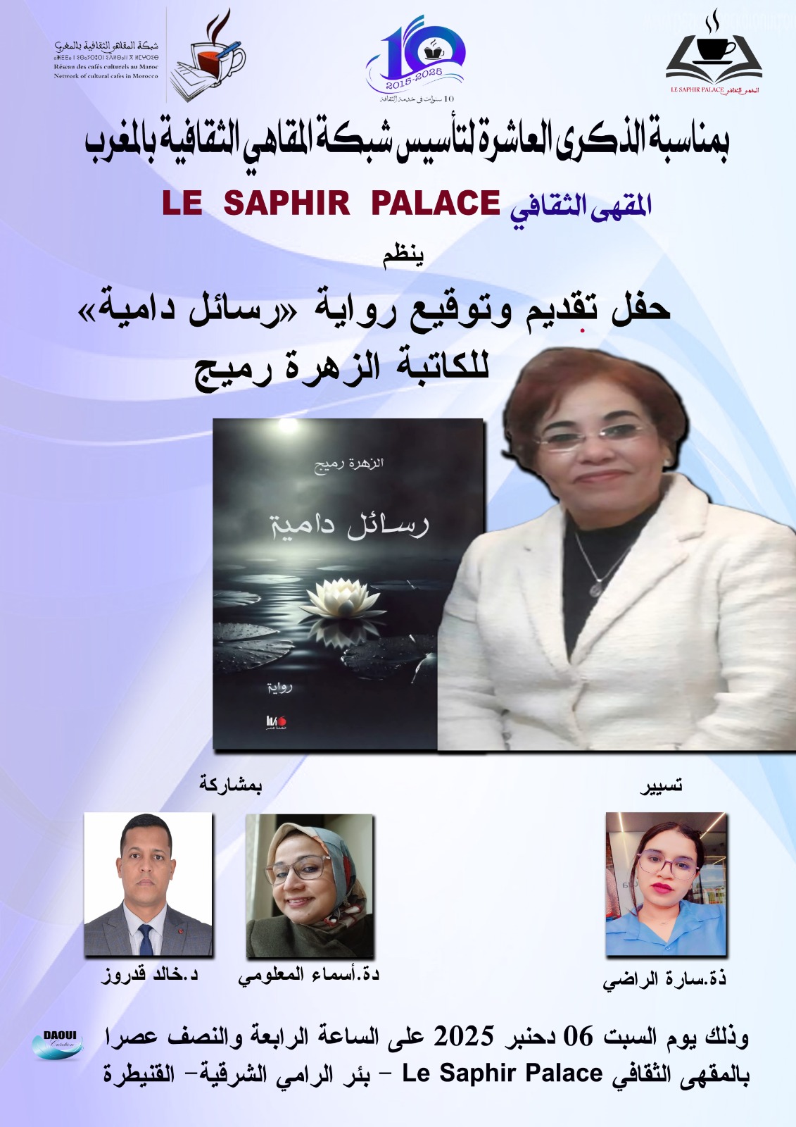 تواصل شبكة المقاهي الثقافية بالمغرب إحتفاليتها العشرية ، بتنظيم حفل تقديم وتوقيع رواية ” رسائل دامية ” للكاتبة الزهرة رميج ، بمشاركة الدكتورة أسماء المعلومي والدكتور خالد قدروز ، و تسير الأستاذة سارة الراضي بالمقهى الثقافي ” لوسافير بلاص ” بمدينة القنيطرة على الساعة الرابعة والنصف عصرا .