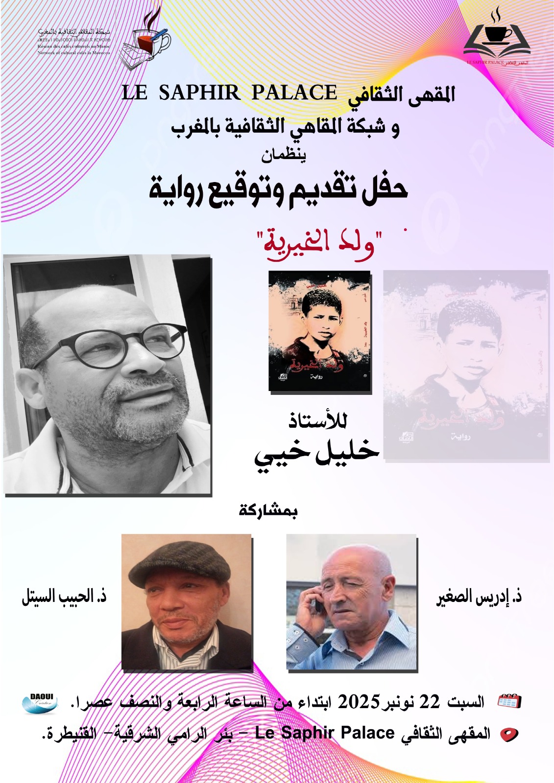 ينظم المقهى الثقافي “لوسافير بلاص ” وشبكة المقاهي الثقافية بالمغرب حفل تقديم وتوقيع رواية ” ولد الخيرية ” للأستاذ خليل خيي ؛ بمشاركة الأستاذين إدريس الصغير ، والحبيب السيتل ، وذلك يوم السبت 22 نونبر إبتداء من الساعة الرابعة والنصف عصرا بمقهى le saphir palace بمدينة القنيطرة .