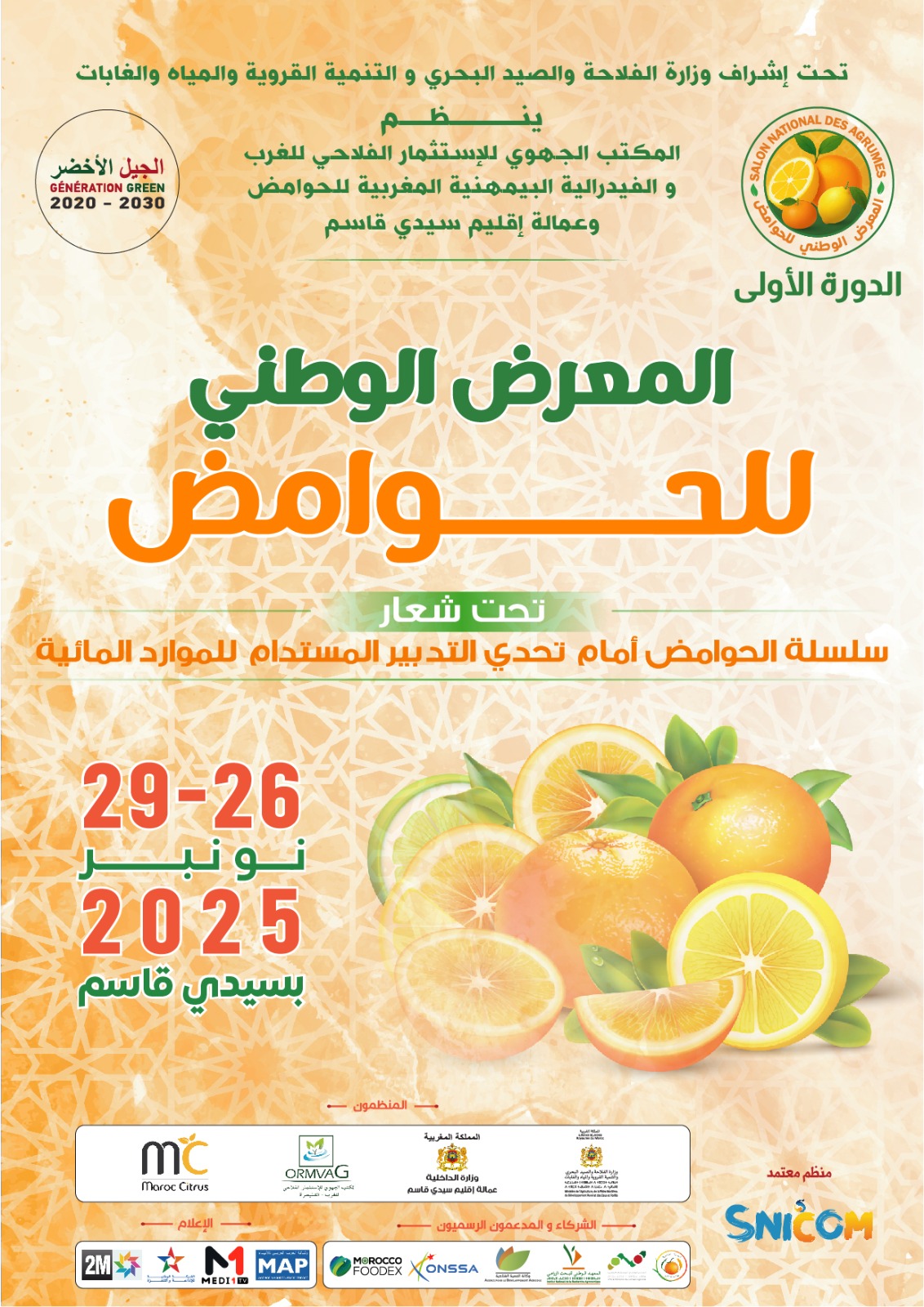 تحت إشراف وزارة الفلاحة والصيد البحري والتنمية القروية والمياه والغابات، ينظم المكتب الجهوي للاستثمار الفلاحي للغرب، بشراكة مع الفيدرالية البيمهنية المغربية للحوامض وبتعاون مع عمالة إقليم سيدي قاسم، الدورة الأولى للمعرض الوطني للحوامض، وذلك خلال الفترة من 26 إلى 29 نونبر 2025 بمدينة سيدي قاسم.