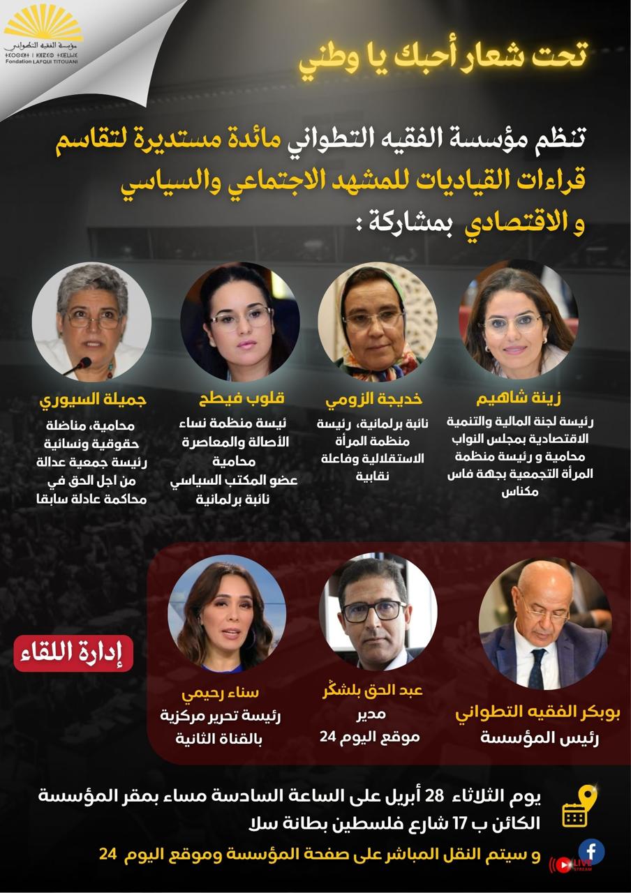 في إطار شعار:* أحبك يا وطني*، باعتباره تعبيرًا عن انخراط واعٍ في قضايا الوطن، وسعيًا إلى الإسهام في نقاش عمومي يتجاوز الانطباع نحو قراءة أكثر تماسكًا لما يجري.تنظم مؤسسة الفقيه التطواني مائدة مستديرة في موضوع ” قياديات يقرأن المشهد الاجتماعي والسياسي والاقتصادي” وذلك مساء الثلاثاء القادم بمقر المؤسسة بسلا.