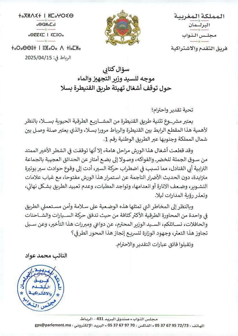 شغل التوقف المفاجئ لأشغال تثنية الطريق الوطنية رقم 1، تحديداً على المقطع الحيوي بين القنيطرة ومدخل سلا المدينة، اهتماماً واسعاً في قبة البرلمان، حيث استلزم تدخلاً رقابياً مباشراً لكشف ملابسات هذا التعطيل الذي يهدد سلامة مستعملي الطريق.