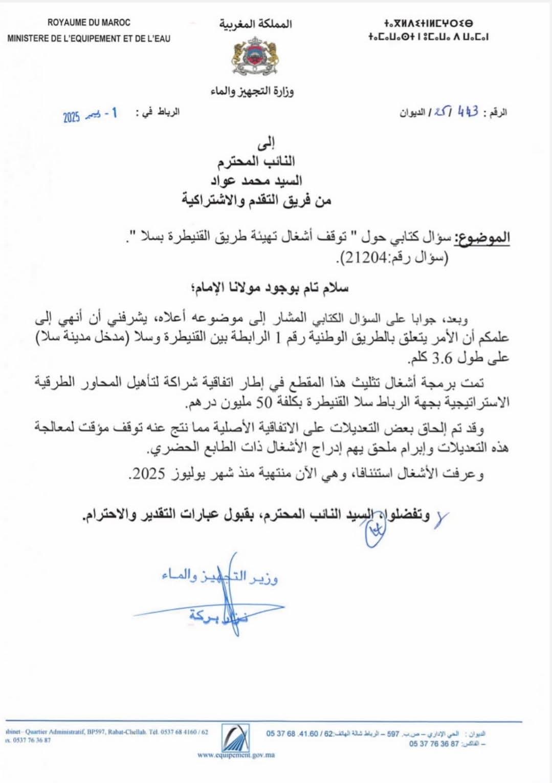 وفي ردها الرسمي، أوضحت وزارة التجهيز والماء أن المشروع، الذي يبلغ طوله 3.6 كلم، قد تم برمجته ضمن اتفاقية إطار استراتيجية لتأهيل المحاور الطرقية بجهة الرباط سلا القنيطرة، بتكلفة مالية تصل إلى 50 مليون درهم. وأقرت الوزارة بالتوقف المؤقت للأشغال، مبررة ذلك بالحاجة إلى معالجة بعض التعديلات على الاتفاقية الأصلية وإبرام ملحق يهدف لإدراج الأشغال ذات الطابع الحضري.