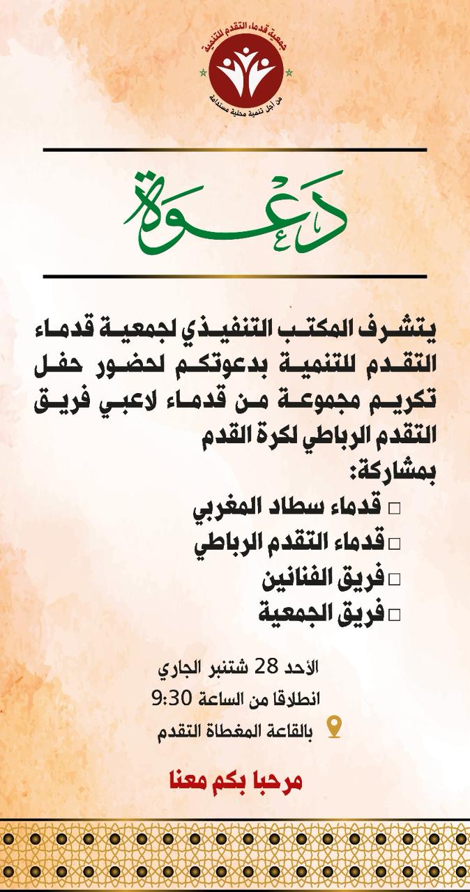 إن تكريم السيد محمد الشرڤاوي يوم الأحد 28 شتنبرالجاري، انطلاقا من الساعة 9:30 صباحا، بالقاعة المغطاة التقدم. من تنظيم جمعية قدماء التقدم للتنمية، يُجسد اعترافاً صادقاً بمساره الرياضي والإنساني، ووفاءً لما قدمه من خدمات جليلة لكرة القدم الوطنية وللأجيال المتعاقبة من اللاعبين، سواء داخل الملاعب أو في مجال التكوين والتسيير.